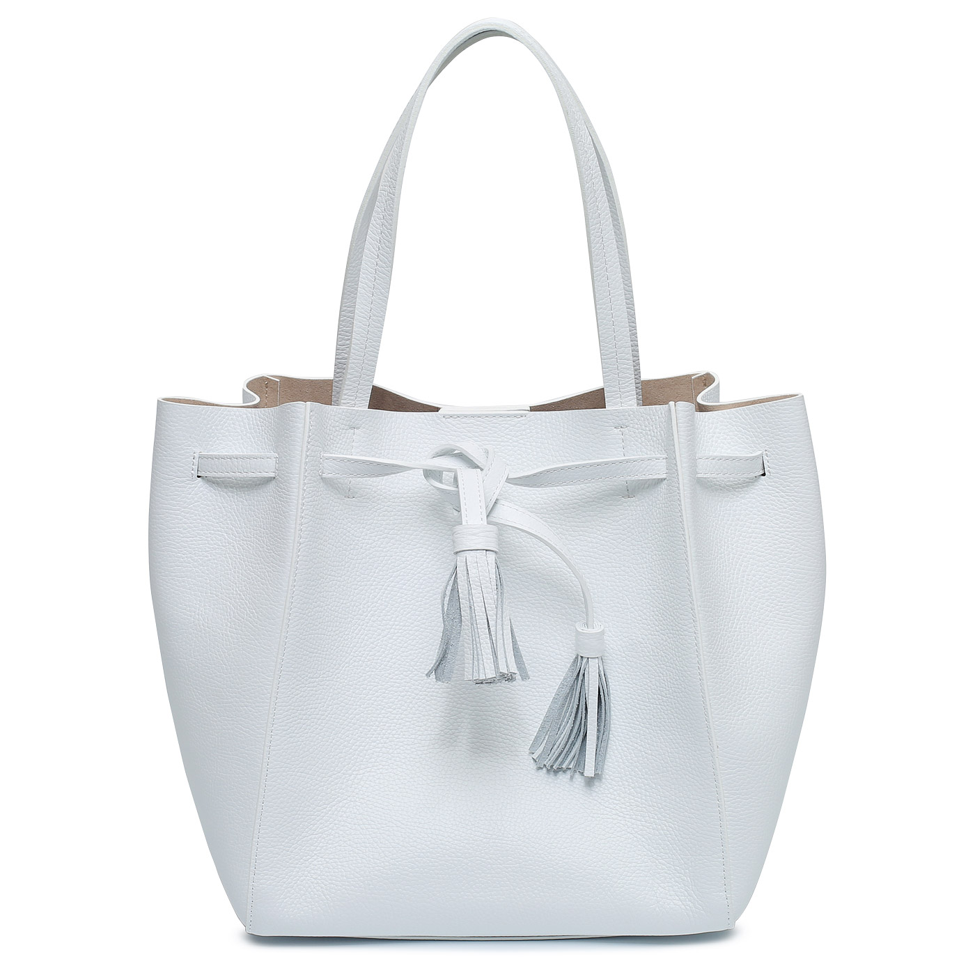 Комплектация: боковые ремешки с кисточками для изменения формы сумки, съемная косметичка